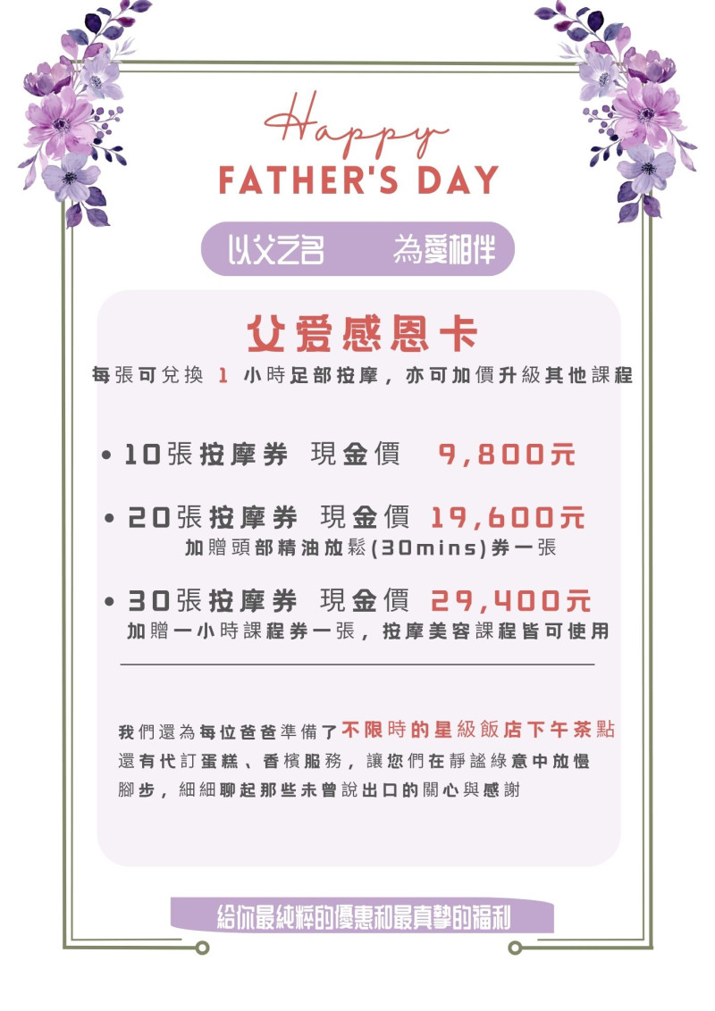 在這個屬於爸爸的節日,我們誠摯邀請您,帶著最重要的男人——您的父親,來丰居微風SPA享受一場身心放鬆的舒心體驗。