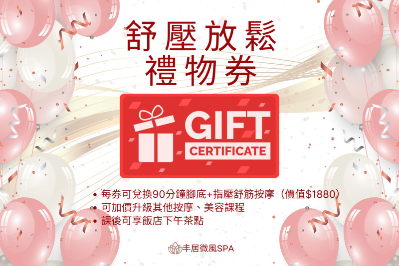Line 舒壓放鬆禮物券每張$1880,可兌換90分鐘腳底+全身指壓舒筋按摩,2張優惠價$3600,預約課程皆享免費暖足泡腳10分鐘(價值$300),放鬆循環從腳開始!