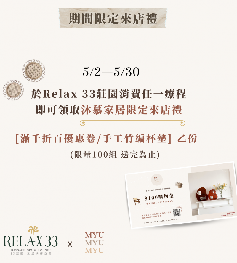 本月份特別提供藤編質感禮品搭配 Relax33莊園放鬆紓壓的南洋渡假風,